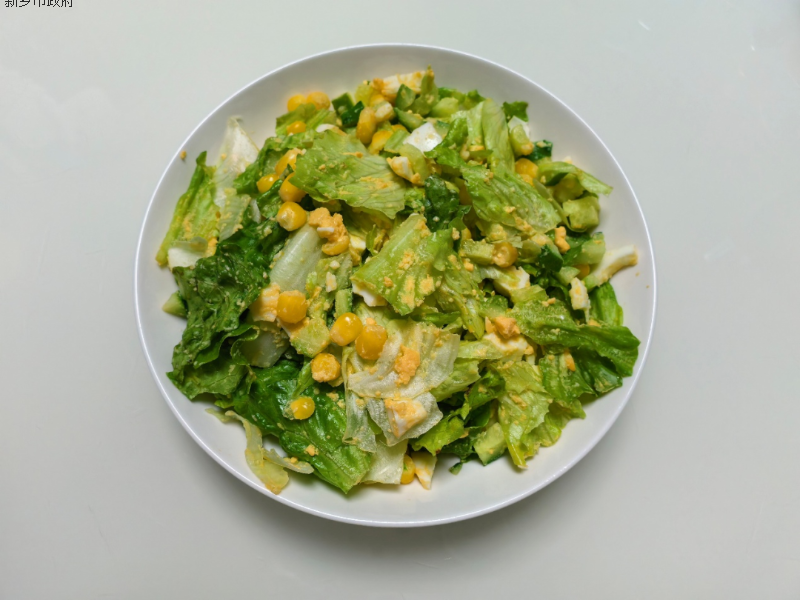 将整颗鸡蛋用勺子压碎,和生菜、玉米粒、黄瓜等均匀的拌在一起。碾碎的鸡蛋黄裹在蔬菜上,不仅不噎,反而让蔬菜沙拉变得绵密可口,增加了蛋黄风味,还省去了高热量的沙拉酱。