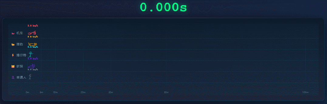 赛跑模拟 从上到下依次为 摩托车、猎豹、博尔特、家猫、普通人 作者制图