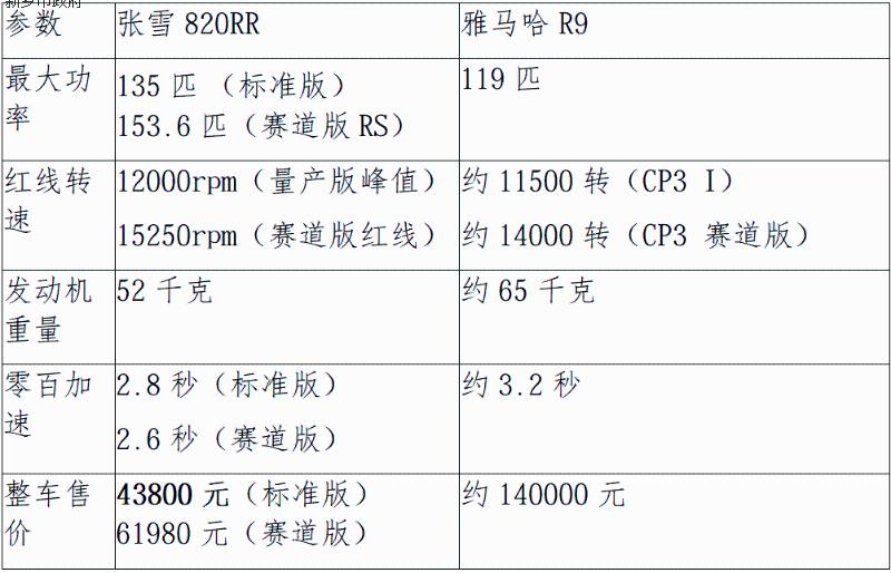 张雪机车的核心是一台排量为 819cc 的直列三缸发动机,堪称价廉物美动力强。咱们先来点直观的对比: