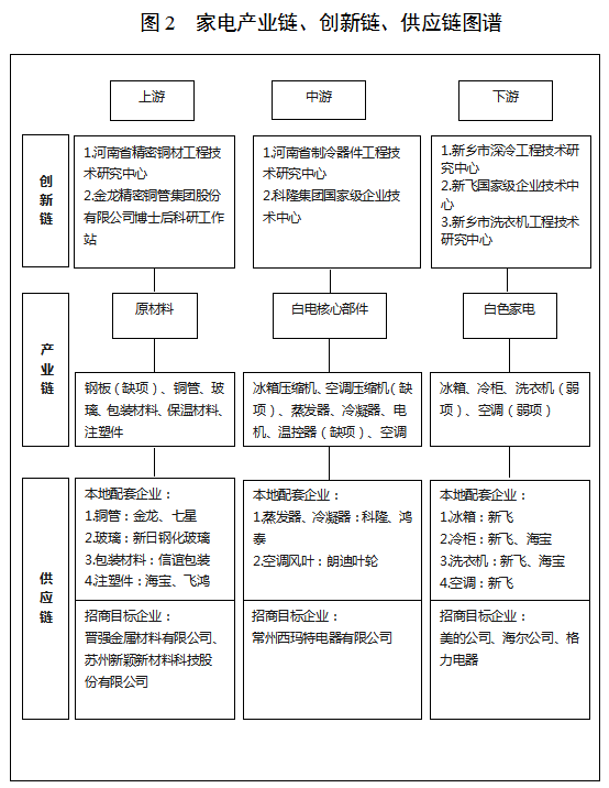 家电行业一是要依托新飞、金龙、科隆等重点企业,瞄准广东、山东等家电产业先进地区,力争引进美的、海尔、格力等国内一线家电企业。二是要贯彻“郑新一体化”发展思路。利用省内郑州大学汉威物联网研究院、中国(郑州)智能传感谷核心区等创新优势,推动产学研用协同创新;把握郑州正在建设格力生产基地的契机,进一步加强我市科隆、金龙等上游企业与郑州家电企业的配套合作,抓住时机做大做强。