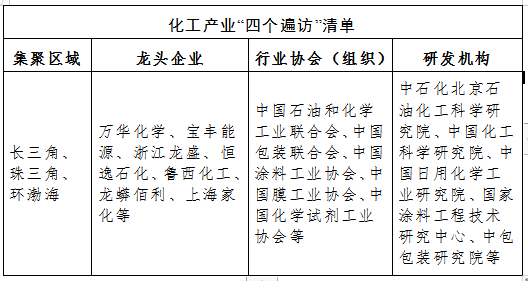 结合我市化工产业重点发展领域做到“四个遍访”,瞄准化工新材料、涂料、日化、化学添加剂、功能性薄膜等具有一定产业基础的行业,积极实施产业链招商,引进高端技术、项目、人才;遍访龙头企业及研发机构,进一步深化企业与高等院校、科研院所合作,促进产业链补齐短板、锻造长板,通过建立产学研一体化联盟、产业技术孵化基地等,构建并畅通基础研究、技术应用、产业转化的科技创新链条,推动创新成果的产业化应用,提高产品附加值;鼓励链上企业积极向上下游延伸,延链、补链、强链,围绕创新链部署产业链、围绕产业链部署供应链,建立以行业龙头企业为核心的全流程产业链体系,同时鼓励中小企业通过协作配套开展合作,促进上下游产业协同发展,形成集群发展优势,提升行业竞争力。