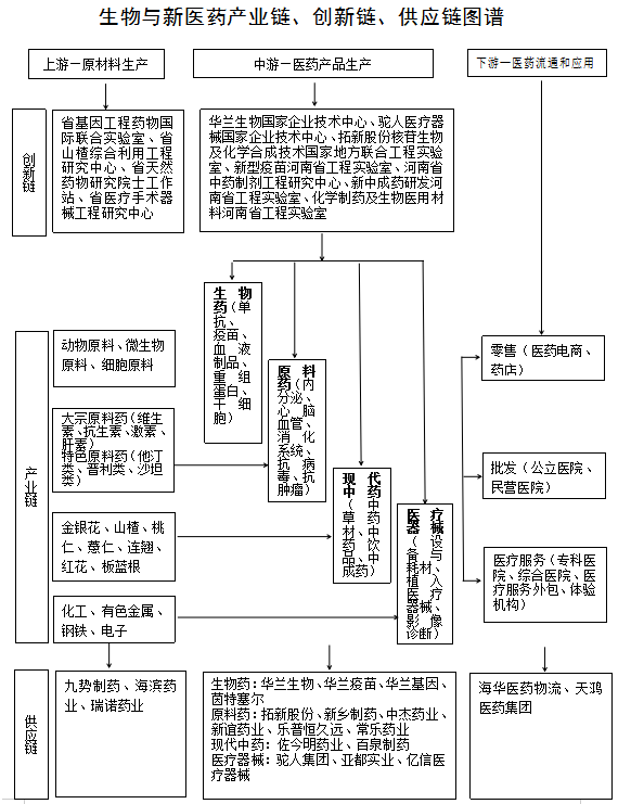 产业链中端,生物技术药领域,开展强链工程,依托高新区万华高科生命产业园、平原示范区生物与新医药专业园区,以广东、上海、北京、浙江、江苏等生物制品产业发展先进地区为目标区域,遍访天坛生物、康泰生物、复星医药等知名企业,在基因工程药物、细胞工程药物等领域开展重点招商,强化我市在生物制品领域的领先地位。高端医疗器械领域,开展延链补链工程,依托长垣市医疗器械专业园区,以广东、山东、浙江、北京等为高端医疗器械集中区为目标,遍访中国医疗器械行业协会、深广高端医疗器械集群、迈瑞医疗、威高股份、华大基因、乐普医疗、鱼跃医疗等,在基因测序、生命信息与支持、医学影像等领域重点招商、延链补链。化学创新药领域,开展延链工程,依托国家自创区生物医药产业共性关键技术创新与转化平台,以长三角地区尤其是浙江、上海、宁波等“长三角医药经济圈”为目标,遍访恒瑞医药、贝达药业、丽珠集团、华东医药、科伦药业,在小分子药、肿瘤药、心血管药、肝病药等领域开展重点招商。现代中药领域,依托太行山优势中药资源,以吉林、山东、广东、云南等中成药企业聚集区为目标,遍访中国中药、红日药业、云南白药、片仔癀、白云山,在中药配方颗粒、中药大品种等领域开展重点招商,补强现代中药产业链。