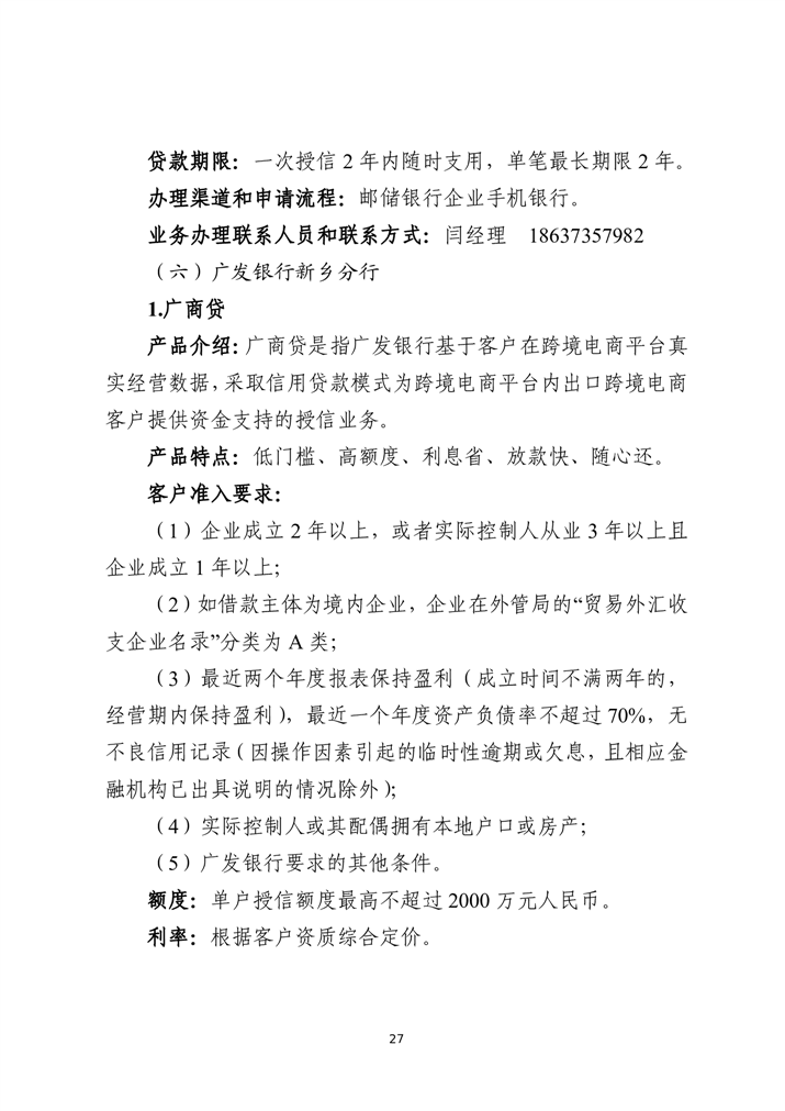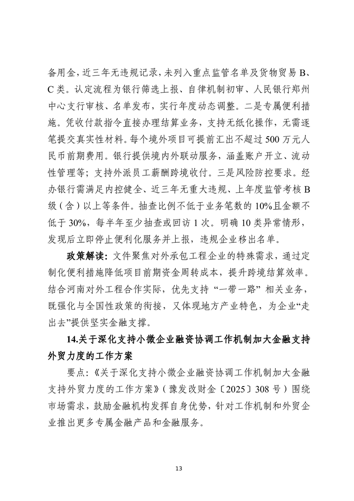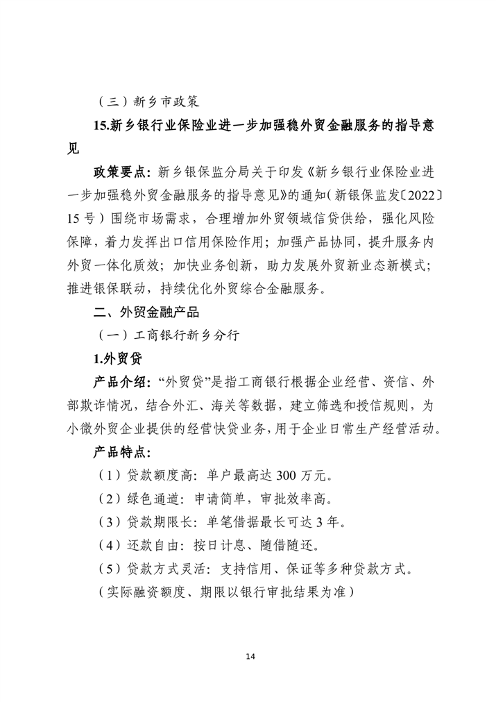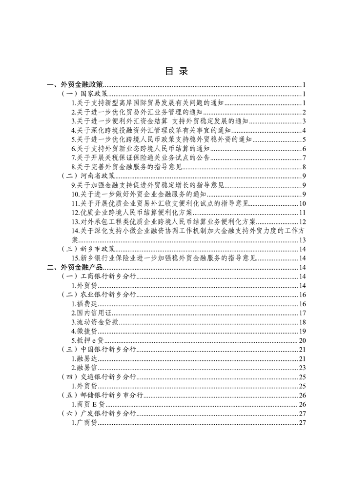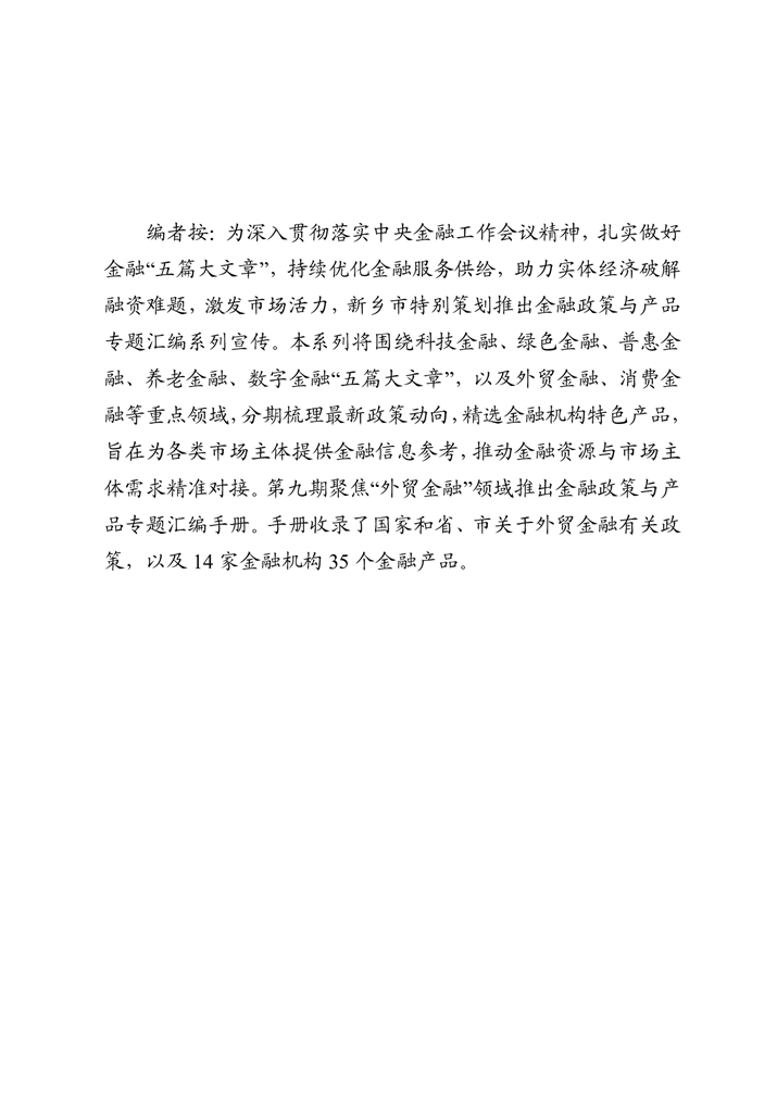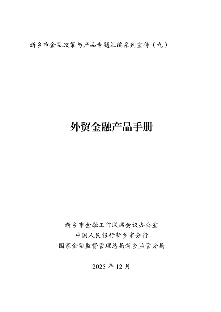 为深入贯彻落实中央金融工作会议精神,扎实做好金融“五篇大文章”,持续优化金融服务供给,助力实体经济破解融资难题,激发市场活力,新乡市特别策划推出金融政策与产品专题汇编系列宣传。本系列将围绕科技金融、绿色金融、普惠金融、养老金融、数字金融“五篇大文章”,以及外贸金融、消费金融等重点领域,分期梳理最新政策动向,精选金融机构特色产品,旨在为各类市场主体提供金融信息参考,推动金融资源与市场主体需求精准对接。第九期聚焦“外贸金融”领域推出金融政策与产品专题汇编手册。手册收录了国家和省、市关于外贸金融有关政策,以及14家金融机构35个金融产品。